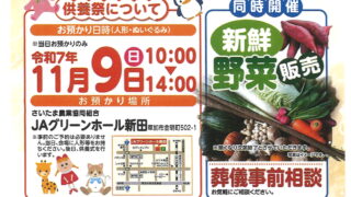 トピック JA埼玉主催!人形・ぬいぐるみ供養祭 告知11月9日人形供養祭を行います。受付時間:10:00-14:00場所:JAグリーンホール新田住所:埼玉県草加市金明町502-1金額¥1,000ー 何体でも受付可ご自宅に眠っている五月人形・雛人形やぬいぐるみ処分に抵抗ある人形などもお持ち... 2025.10.06 トピック草加・八潮のお役立ち情報